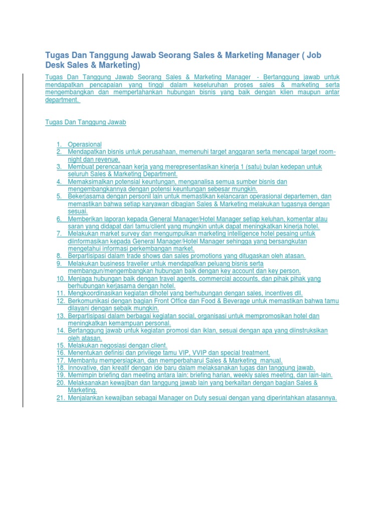 Tugas dan tanggung jawab dari seorang Manager Penjualan atau Marketing Manager adalah. Membuat analisa terhadap pangsa pasar dan menentukan strategi penjualan terhadap konsumen atau pelanggan. Assists with check-in check-out responds to guest requests and complaints.